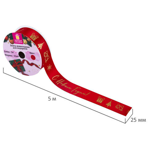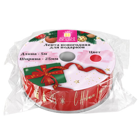 Упаковочная лента новогодняя для декора и подарков 25 мм х 5 м, КРАСНАЯ, с тиснением, ЗОЛОТАЯ СКАЗКА, 592414