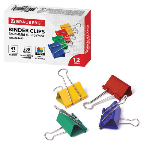 Зажимы для бумаг BRAUBERG, КОМПЛЕКТ 12 шт., 41 мм, на 200 листов, цветные, картонная коробка, 224473