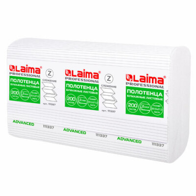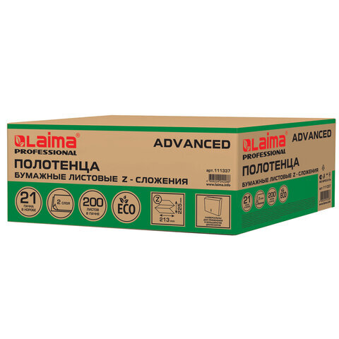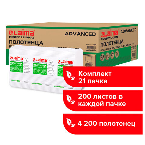 Полотенца бумажные 200 шт., LAIMA (H2) ADVANCED, 2-слойные, белые, КОМПЛЕКТ 21 пачка, 22,5х21,3, Z-сложение, 111337