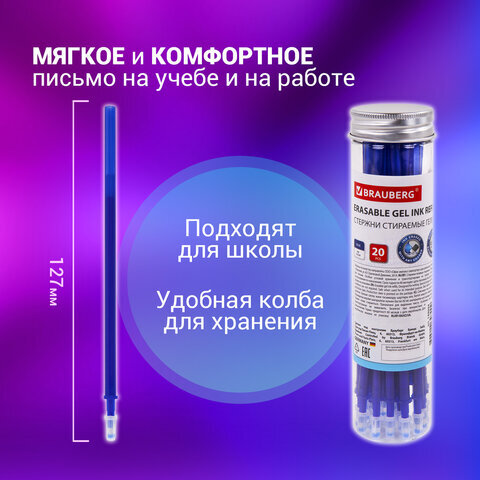 Стержни стираемые гелевые в ПЛАСТИКОВОЙ ТУБЕ, СИНИЕ, КОМПЛЕКТ 20 ШТУК, игольчатый наконечник 0,5 мм, линия 0,35 мм, 144094