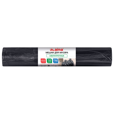 Мешки для мусора 200л черные в рулоне 10 штук сверхпрочные, ПВД 80 мкм, 90x130см, LAIMA, 702677
