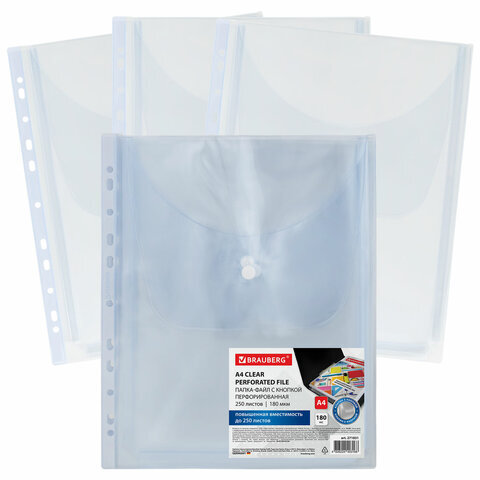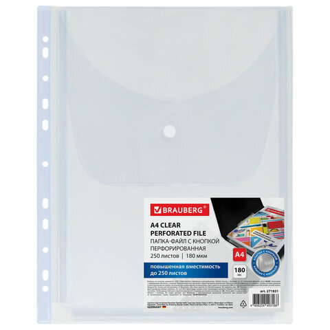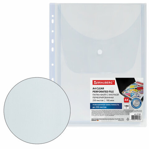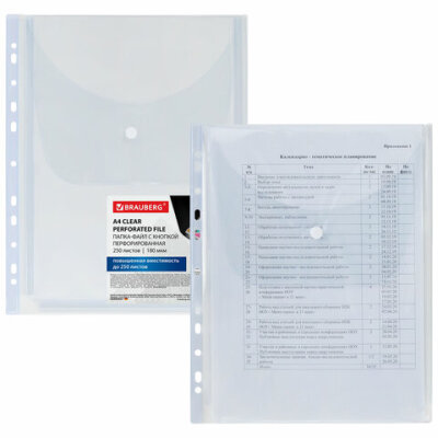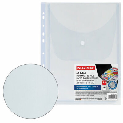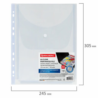 Папка-файл с перфорацией 1 штука с кнопкой БОЛЬШОЙ ВМЕСТИМОСТИ до 250 л., ПВХ 180 мкм, BRAUBERG, 271831