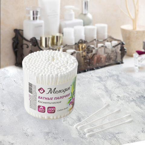 Ватные палочки КОМПЛЕКТ 200 шт., МЕЛОДИЯ, пластиковый стакан, 128857