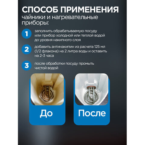 Средство для удаления накипи в чайниках, кофеварках, паровых утюгах, стиральных машинах и других водонагревательных приборах, кроме эмалированных. Одного флакона средства достаточно для обработки двух чайников обычной емкости. Не требует кипячения.
