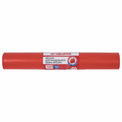Мешки для раздельного сбора мусора 120 л красные в рулоне 10 шт., ПВД 38 мкм, 70х108 см, LAIMA, 606706, 3859
