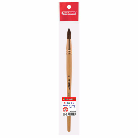 Кисть ПИФАГОР, БЕЛКА, круглая, № 10, деревянная лакированная ручка, с колпачком, пакет с подвесом, 200824
