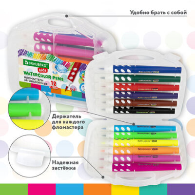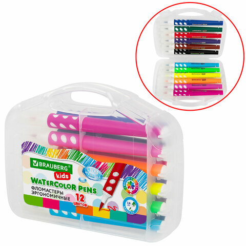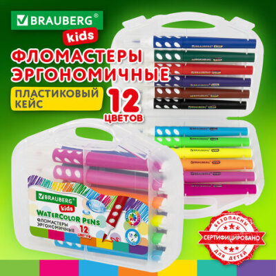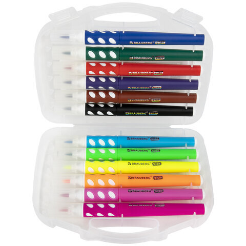 Фломастеры в суперкейсе эргономичные 12 цветов, наконечник-кисть, вентилируемый колпачок, BRAUBERG KIDS, 152184