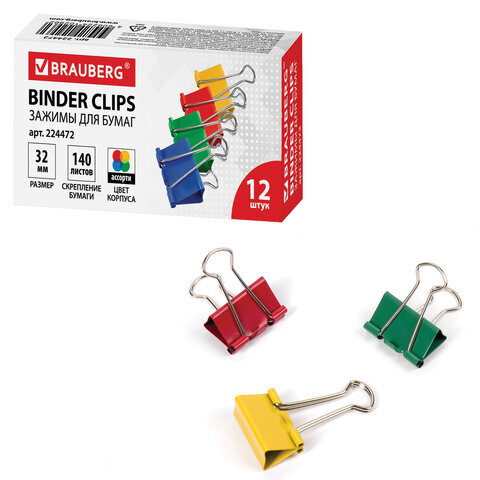 Зажимы для бумаг BRAUBERG, КОМПЛЕКТ 12 шт., 32 мм, на 140 листов, цветные, картонная коробка, 224472