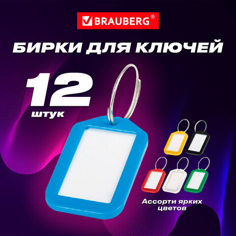 Бирки для ключей КОМПЛЕКТ 12 шт., длина 50 мм, инфо-окно 35х20 мм, АССОРТИ, BRAUBERG, 231152
