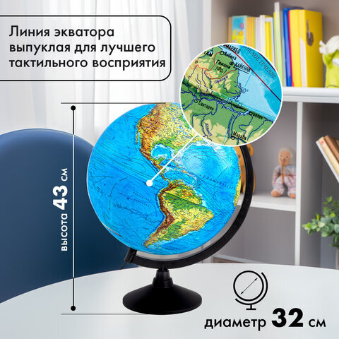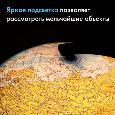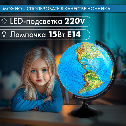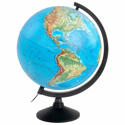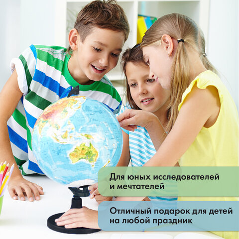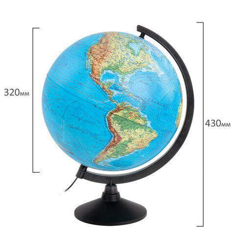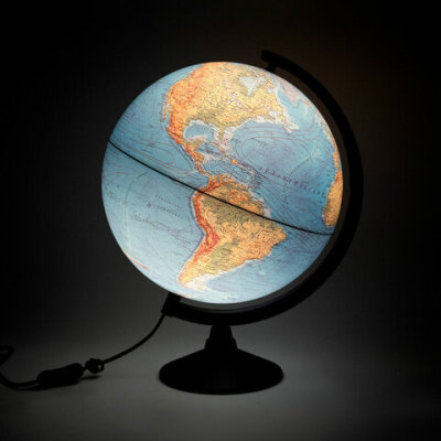 Глобус позволит ознакомиться с физической картой мира. Подходит для использования в детских садах и школах. Поможет узнать рельеф земной поверхности, абсолютные глубины океанов, найти самые высокие и самые глубокие места планеты.