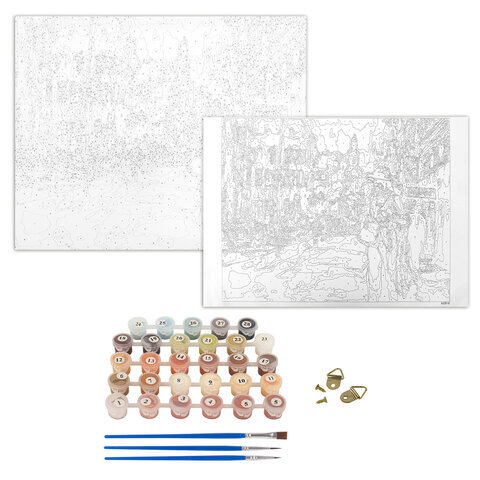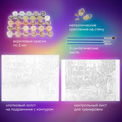 | Комплектация | акриловые краски, кисть, крепеж, лист бумаги для тренировки, холст на подрамнике |