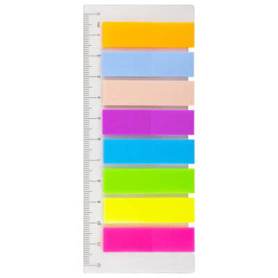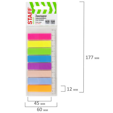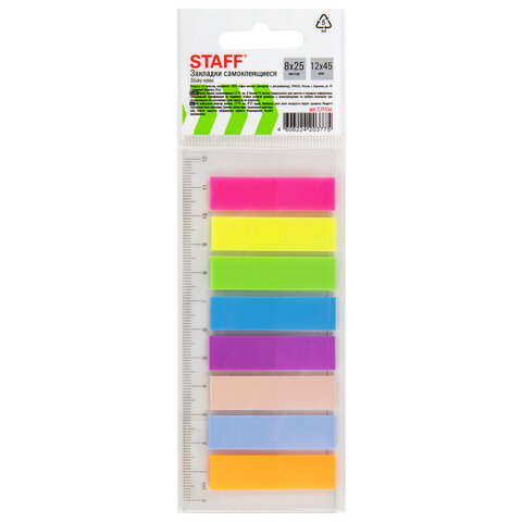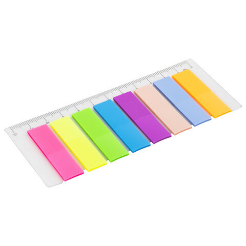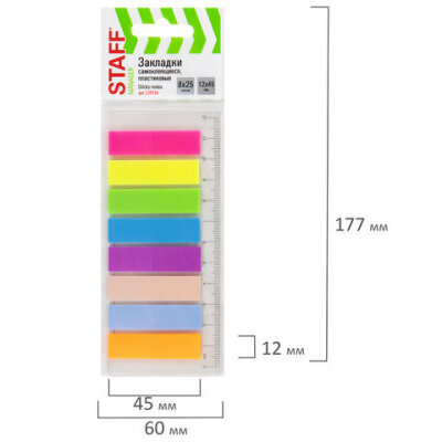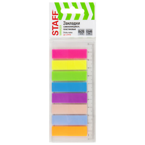 Закладки клейкие неоновые STAFF, 45х12 мм, 200 штук (8 цветов х 25 листов), на пластиковой линейке 12 см, 129356