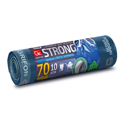 Мешки для мусора 70 л, синие, с ЗАВЯЗКАМИ, в рулоне 10 шт., ПВД, 60х78 см, 20 мкм, GRIFON, 101-184