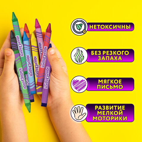 Восковые мелки ЮНЛАНДИЯ идеальны для создания первых "шедевров" во время рисования и раскрашивания. Можно использовать на бумаге любого типа, а также дереве, картоне и стекле.