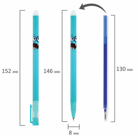 Стираемая ручка ЮНЛАНДИЯ "Монстрики" пишет специальными гелевыми чернилами, которые становятся невидимыми при нагревании. Нагрев достигается ластиком, встроенным в корпус ручки. Возможность многократного стирания и повторного письма.