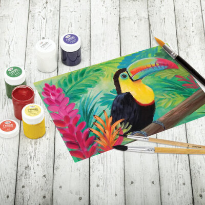Краски имеют яркие цвета, каждый флакон оснащен завинчивающейся крышкой. Гуашь предназначена для выполнения творческих работ в начальных классах и дошкольных учреждениях, а также дома.