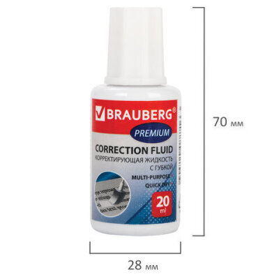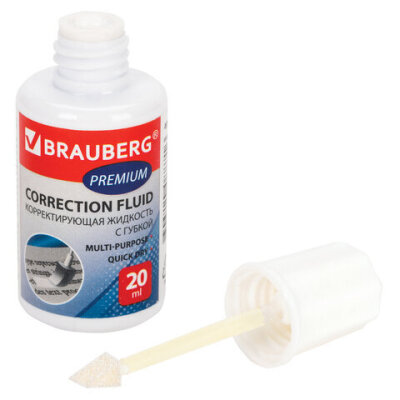 Корректирующая жидкость BRAUBERG "Premium" быстросохнущая, 20 мл, с губчатым аппликатором, 224090