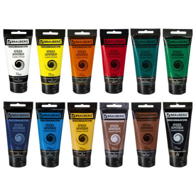 Краски акриловые художественные глянцевые 12 цветов в тубах по 75 мл, BRAUBERG ART CLASSIC, 192426