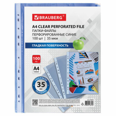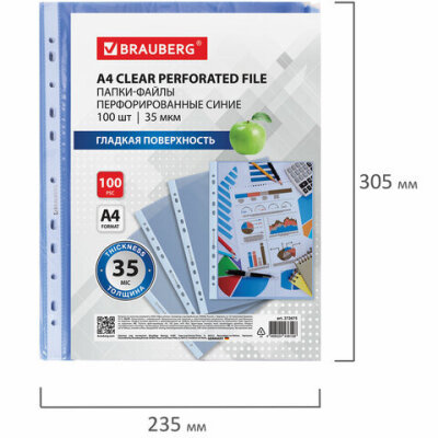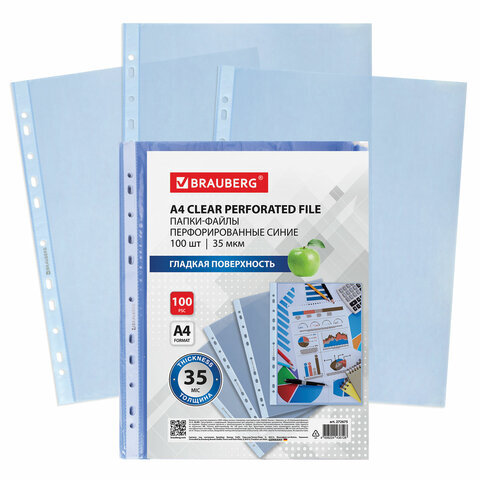 Папки-файлы перфорированные СИНИЕ А4 BRAUBERG, комплект 100 шт., гладкие, 35 мкм, 272675