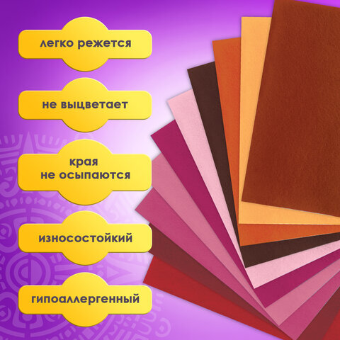 Цветной фетр МЯГКИЙ А4, 1 мм, 10 листов, 10 цветов, плотность 160 г/м2, Солнечный, ОСТРОВ СОКРОВИЩ, 660653