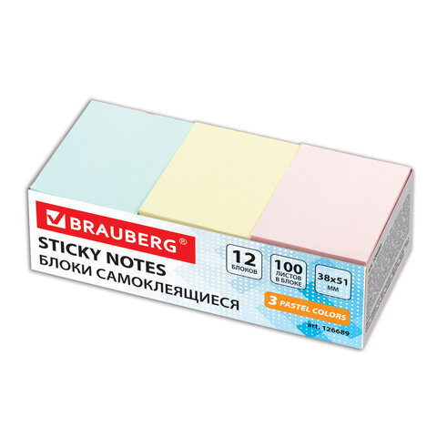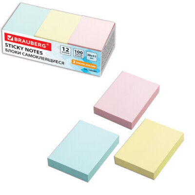 Блоки самоклеящиеся (стикеры) BRAUBERG, ПАСТЕЛЬНЫЕ 38х51 мм, 100 листов, НАБОР 12 шт., 3 цвета, 126689