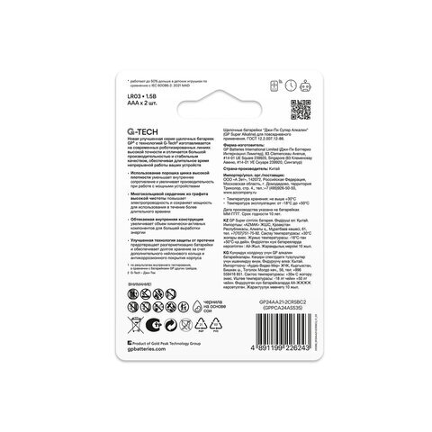 Батарейки КОМПЛЕКТ 2 шт., GP Super G-Tech, AAA (LR03, 24А), алкалиновые, мизинчиковые, блистер, 24A-2, 24A-2CR2