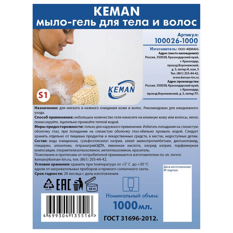 Жидкое мыло-гель КЕМАN предназначено для мягкого и нежного очищения тела и волос. Рекомендовано для ежедневного ухода.