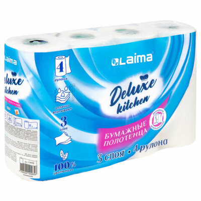 Полотенца бумажные 3-х слойные, 4 рулона по 11 м (отрыв 1/2 листа), LAIMA Deluxe, 100% целлюлоза, 115400