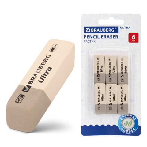 Ластики BRAUBERG "Ultra" 6 шт., размер ластика 41х14х8 мм, серо-белые, натуральный каучук, 229600