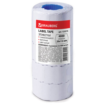 Этикет-лента 26х12 мм, волна, белая, комплект 5 рулонов по 800 шт., BRAUBERG, 123576