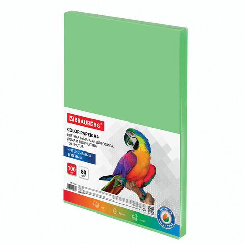 Бумага цветная BRAUBERG, А4, 80 г/м2, 100 л., интенсив, зеленая, для офисной техники, 112451