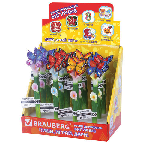 Ручка фигурная "БАБОЧКИ", СИНЯЯ, 4 дизайна ассорти, 0,5 мм, дисплей, BRAUBERG, 142776