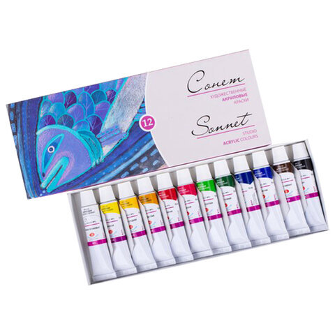 Краски акриловые художественные "Сонет", НАБОР 12 цветов по 10 мл, в тубах, Невская Палитра, 2841095