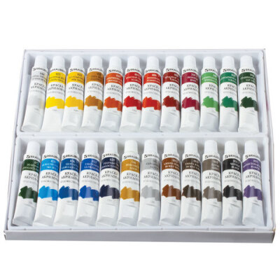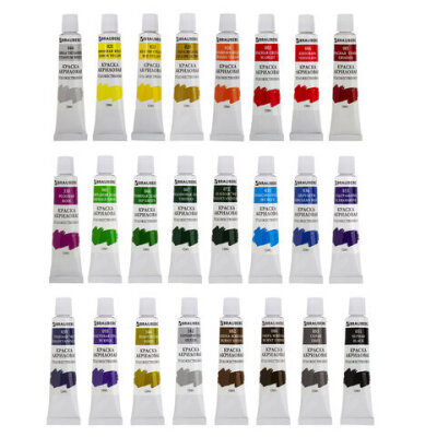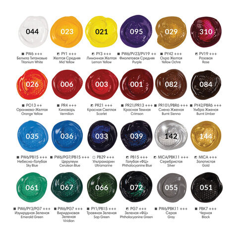 | Цвет | белила титановые (044), виридоновый зеленый (067), голубой ФЦ (039), желтая средняя (023), зеленый ФЦ (072), золотистый (144), изумрудный зеленый (061), киноварь (006), красная светлая (003), красная темная (001), лимонная желтая (021), небесно-голубой (035), оранжево-желтый (026), охра желтая (029), розовый (310), серебристый (142), серый (055), сиена жженая (082), травяной зеленый (066), ультрамарин (033), умбра жженая (084), фиолетовый средний (095), церулеум (036), черный (051) |