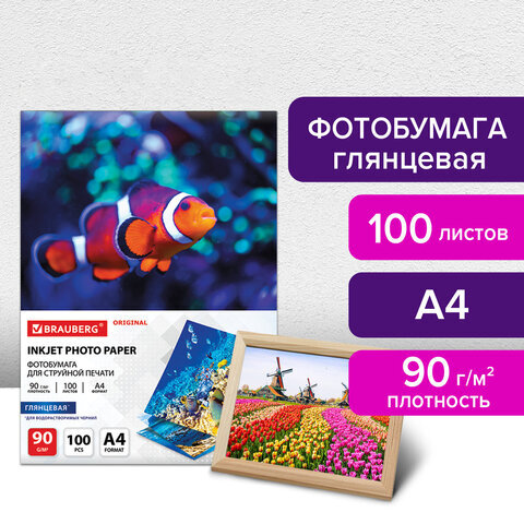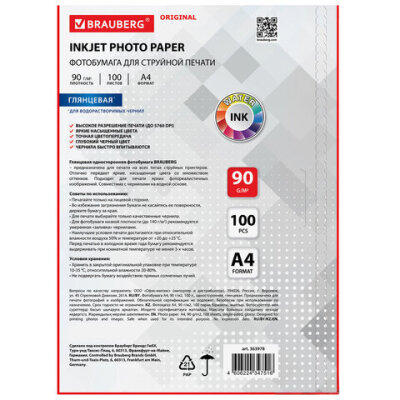 Фотобумага глянцевая, А4, 90 г/м2, односторонняя, 100 листов, BRAUBERG ORIGINAL, 363978