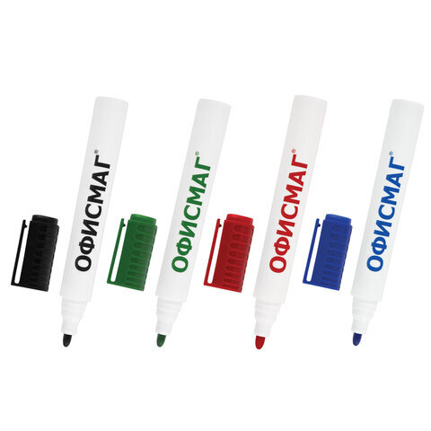 Маркеры стираемые для белой доски НАБОР 4 ЦВЕТА, ОФИСМАГ, круглый наконечник, 3 мм, 152222