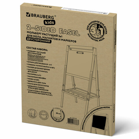 • Мольберт растущий двусторонний BRAUBERG KIDS предназначен для развития творческих способностей ребенка и обустройства игрового пространства в детских учреждениях и дома.