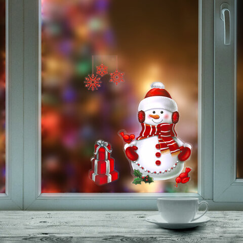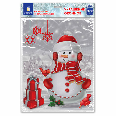 Наклейка для окон двусторонняя МНОГОРАЗОВАЯ 30х38 см, "Снеговик с подарками", ЗОЛОТАЯ СКАЗКА, 591922