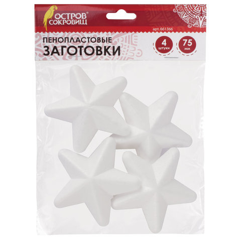 Пенопластовые заготовки для творчества "Звездочки", 4 шт., 75 мм, ОСТРОВ СОКРОВИЩ, 661366
