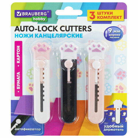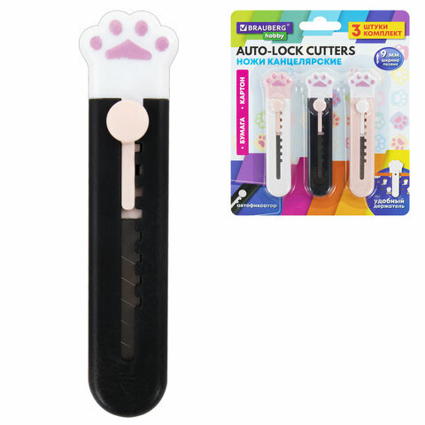 Нож канцелярский "Лапки", Cat Paw, 9 мм, НАБОР 3 шт. на блистере, автофиксатор, BRAUBERG HOBBY, 238345