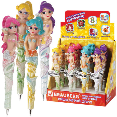 Ручка фигурная "РУСАЛОЧКИ", СИНЯЯ, 4 дизайна ассорти, линия письма 0,5 мм, дисплей, BRAUBERG, 142761