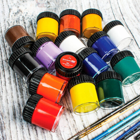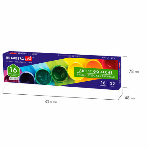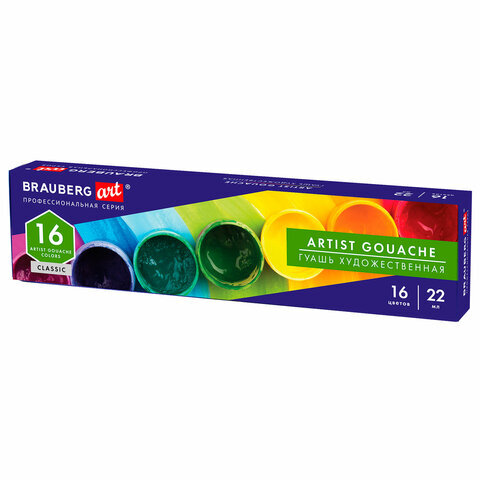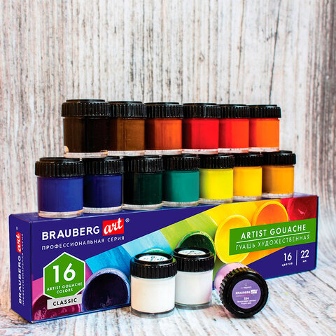 Гуашь художественная BRAUBERG ART CLASSIC, НАБОР 16 цветов в баночках по 22 мл, 191584