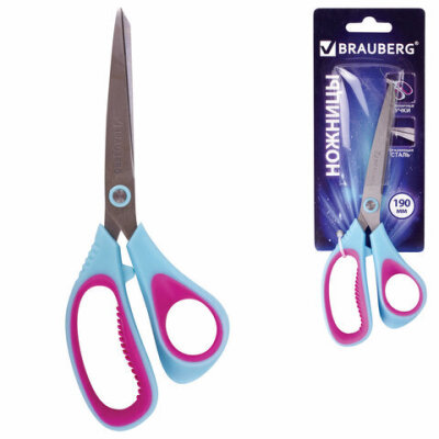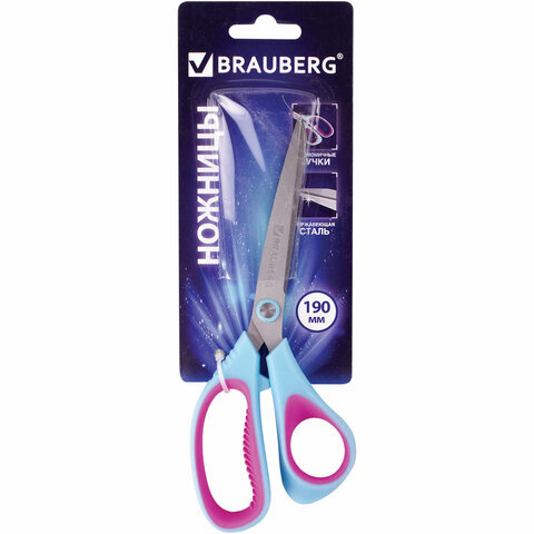Ножницы BRAUBERG "Universal", 190 мм бирюзово-фиолетовые, ассиметричные, ребристые резиновые вставки, 236452