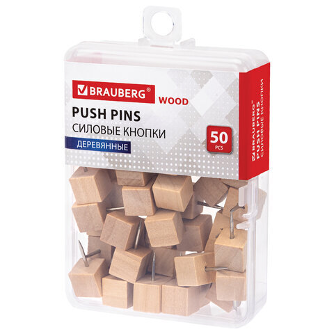 Силовые кнопки-гвоздики BRAUBERG WOOD, деревянные (кубики), 50 штук, 10 мм, 272762
