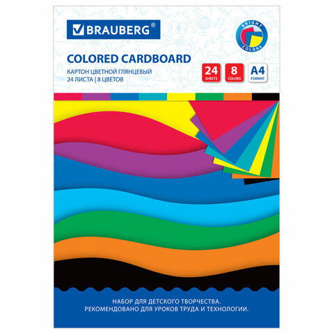 Картон цветной А4 МЕЛОВАННЫЙ, 24 листа, 8 цветов, в папке, BRAUBERG, 200х290 мм, "Цвета", 113550