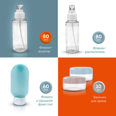 | Типы флаконов в наборе | баночка для крема, флакон с крышкой флип-топ, флакон-дозатор, флакон-распылитель |