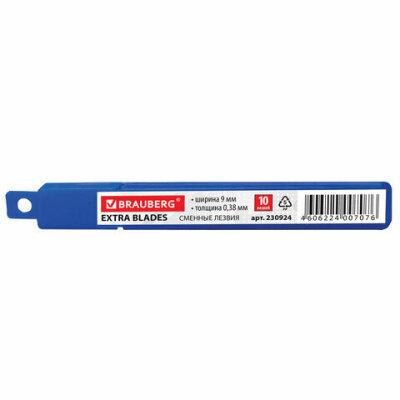 Лезвия для ножей 9 мм BRAUBERG, КОМПЛЕКТ 10 шт., толщина лезвия 0,38 мм, в пластиковом пенале, 230924
