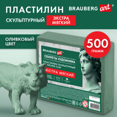 Пластилин скульптурный ЭКСТРА МЯГКИЙ ОЛИВКОВЫЙ "Секреты художника", 0,5 кг, BRAUBERG ART, 107505