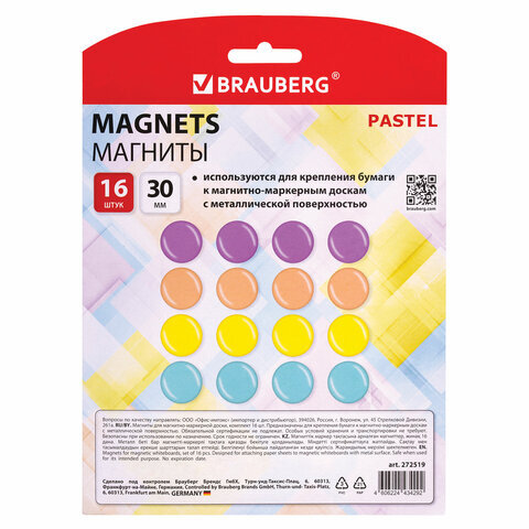 Магниты 30 мм, НАБОР 16 шт., BRAUBERG "PASTEL", блистер, 272519