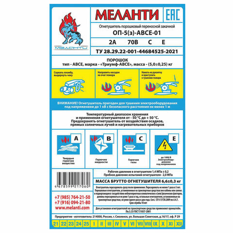 | Огнетушащая способность | 70В/2А |